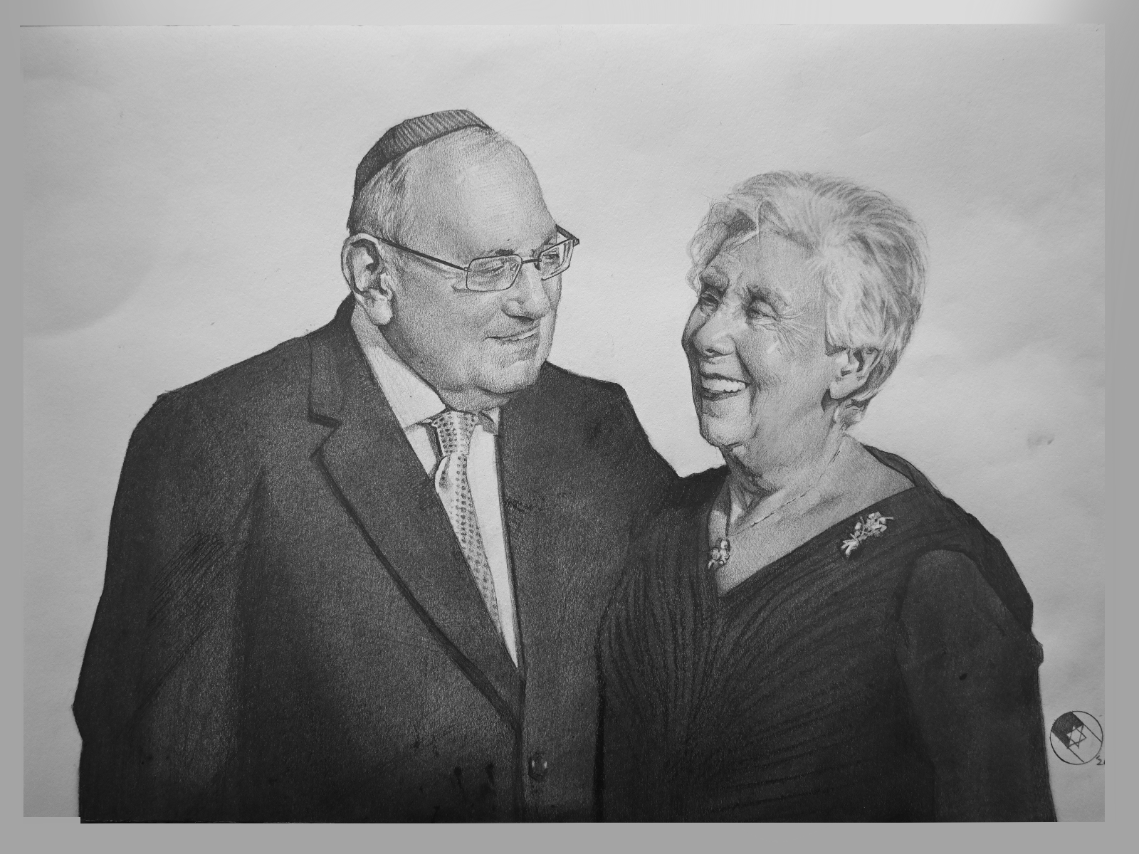 This drawing was an incredible opportunity to celebrate the life and love of this sweet couple. I wanted to create a piece that highlighted the history and depth of the couples relationship. I loved working on the piece and watching it grow.